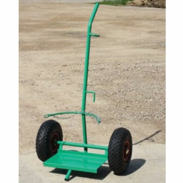 Chariot pour bouteille de gaz 13 kg. Chariot équipé de deux roues grand modèle gonflables. Chaine de sécurité pour le maintien de la bouteille. Couleur vert. Poids : 3,4 kg.